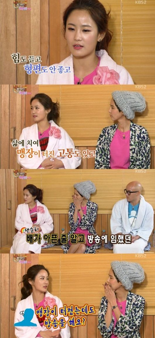 김지민은 30일 방송된 KBS 2TV 예능프로그램 ‘해피투게더3’에서 “방송이 많이 없던 시절에는 맹장이 터졌는데도 방송을 했다. 이후에 병원에 갔더니 ‘어떻게 맹장이 터졌는데도 방송을 했냐’고 물었다”고 절박했던 시절을 털어놨다.
