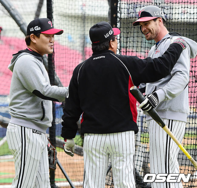 31일 오후 서울 잠실야구장에서 열리는 '2014 한국야쿠르트 세븐 프로야구' 포스트시즌 4차전 LG 트윈스와 넥센 히어로즈의 경기를 앞두고, LG 김무관 코치와 스나이더가 대화를 나누고 있다.
