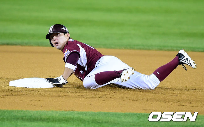 31일 오후 서울 잠실야구장에서 열린 '2014 한국야쿠르트 세븐 프로야구' 포스트시즌 4차전 LG 트윈스와 넥센 히어로즈의 경기, 1회초 무사 1루에서 넥센 서건창이 로티노 타석에 2루 도루를 성공시키고 있다.