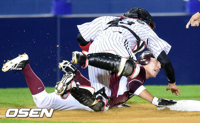31일 오후 서울 잠실구장에서 열린 2014 한국야쿠르트 세븐 프로야구 포스트시즌 플레이오프 4차전 LG 트윈스와 넥센 히어로즈의 경기 1회초 무사 1,3루 유한준의 땅볼상황, 3루주자 서건창이 홈으로 쇄도하다 3루 귀루 중 최경철에 태그아웃 당하고 있다.