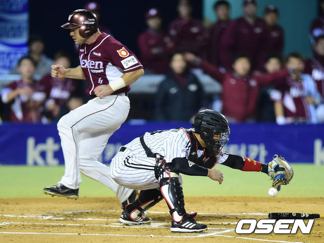 31일 오후 서울 잠실구장에서 열린 2014 한국야쿠르트 세븐 프로야구 포스트시즌 플레이오프 4차전 LG 트윈스와 넥센 히어로즈의 경기 1회초 1사 만루 강정호의 내야안타 상황, 3루주자 로티노가 득점하고 있다.