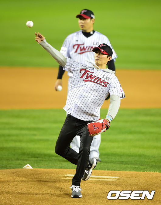 31일 오후 서울 잠실야구장에서 열린 '2014 한국야쿠르트 세븐 프로야구' 포스트시즌 4차전 LG 트윈스와 넥센 히어로즈의 경기, 경기에 앞서 가수 god 데니안이 시구를 하고 있다.