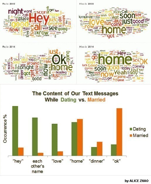 특히 결혼을 전후해 문자 메시지의 내용이 변했는지가 공개됐는데, 결과에 따르면 연애 기간에는 상대를 부르는 말인 '헤이(Hey)'를 많이 썼고 '서로의 이름'이나 '사랑'이라는 단어를 주로 사용했다.