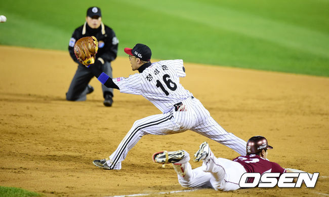 31일 오후 서울 잠실야구장에서 열린 '2014 한국야쿠르트 세븐 프로야구' 포스트시즌 4차전 LG 트윈스와 넥센 히어로즈의 경기, 4회초 2사 1루에서 넥센 박동원이 내야 땅볼을 날리고 1루에서 헤드퍼스트 슬라이딩을 하며 세이프되고 있다.