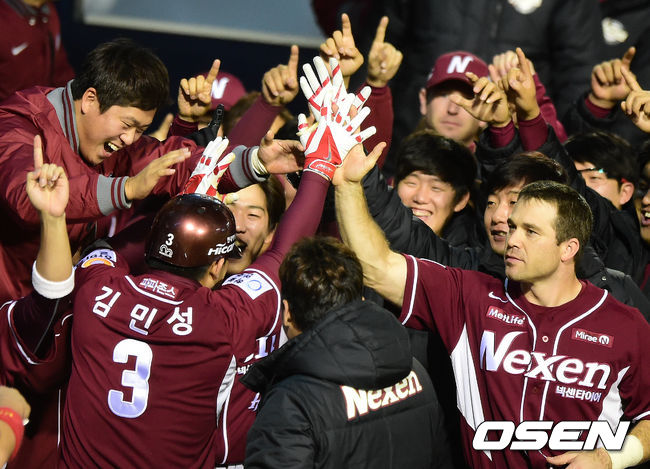 31일 오후 서울 잠실야구장에서 열린 '2014 한국야쿠르트 세븐 프로야구' 포스트시즌 4차전 LG 트윈스와 넥센 히어로즈의 경기, 5회초 2사 1,3루에서 넥센 김민성이 스리런포를 날리고 더그아웃에서 동료선수들과 기뻐하고 있다.