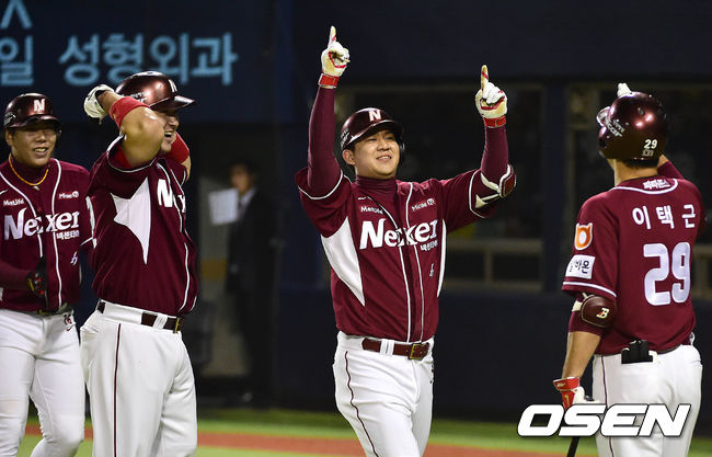 5회초 넥센 공격 2사 1, 3루 상황 김민성이 도망가는 좌월 스리런포를 날리고 홈을 밟은 뒤 동료들과 환호하고 있다.