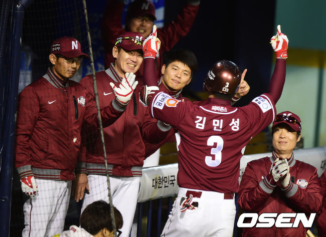 31일 오후 서울 잠실야구장에서 열린 '2014 한국야쿠르트 세븐 프로야구' 포스트시즌 4차전 LG 트윈스와 넥센 히어로즈의 경기, 5회초 2사 1,3루에서 넥센 김민성이 스리런포를 날리고 더그아웃에서 염경엽 감독, 이강철 코치의 축하를 받고 있다.