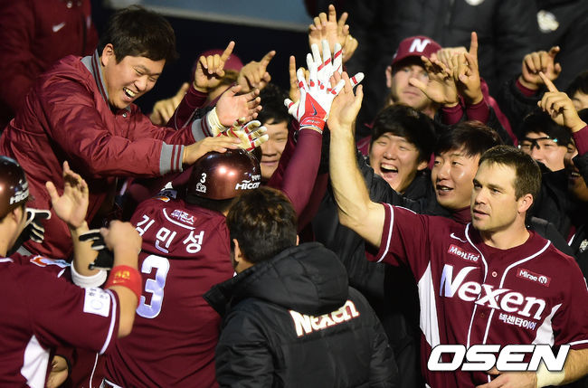 31일 오후 서울 잠실야구장에서 열린 '2014 한국야쿠르트 세븐 프로야구' 포스트시즌 4차전 LG 트윈스와 넥센 히어로즈의 경기, 5회초 2사 1,3루에서 넥센 김민성이 스리런포를 날리고 더그아웃에서 동료선수들과 기뻐하고 있다.