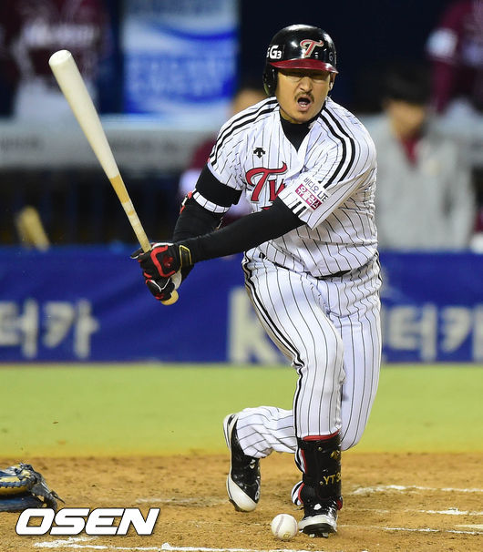 31일 오후 서울 잠실구장에서 열린 2014 한국야쿠르트 세븐 프로야구 포스트시즌 플레이오프 4차전 LG 트윈스와 넥센 히어로즈의 경기 6회말 선두타자 박용택이 자신의 타구에 발을 맞고 고통스러워 하고 있다.