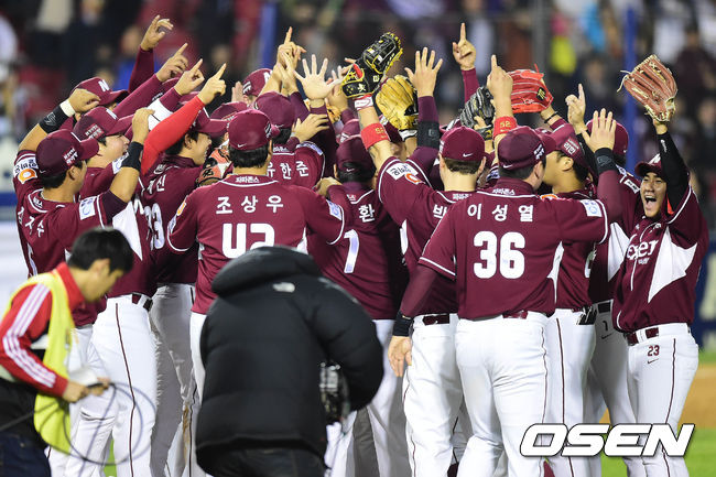31일 오후 서울 잠실구장에서 열린 2014 한국야쿠르트 세븐 프로야구 포스트시즌 플레이오프 4차전 LG 트윈스와 넥센 히어로즈의 경기 종료 후 넥센 선수들이 환호하고 있다.