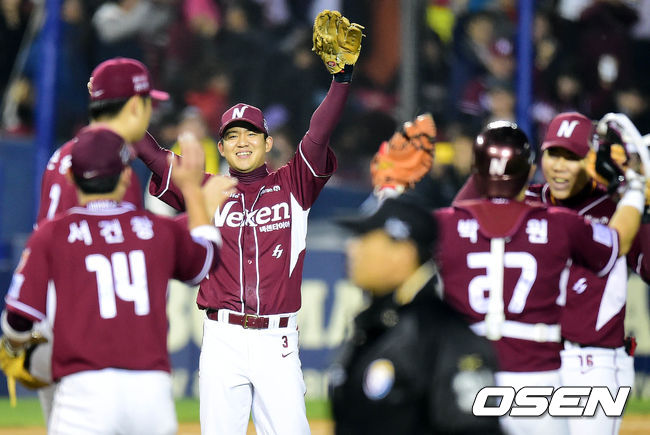 31일 오후 서울 잠실구장에서 열린 2014 한국야쿠르트 세븐 프로야구 포스트시즌 플레이오프 4차전 LG 트윈스와 넥센 히어로즈의 경기 종료 후 김민성이 환호하고 있다.