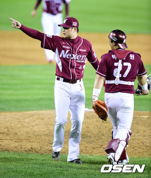 31일 오후 서울 잠실구장에서 열린 2014 한국야쿠르트 세븐 프로야구 포스트시즌 플레이오프 4차전 LG 트윈스와 넥센 히어로즈의 경기, 경기후 넥센 손승락이 세리머니를 하고 있다.