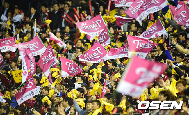 31일 오후 서울 잠실구장에서 열린 2014 한국야쿠르트 세븐 프로야구 포스트시즌 플레이오프 4차전 LG 트윈스와 넥센 히어로즈의 경기, 9회말 LG 팬들이 열띤 응원을 하고 있다.