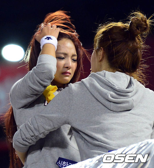 31일 오후 서울 잠실구장에서 열린 2014 한국야쿠르트 세븐 프로야구 포스트시즌 플레이오프 4차전 LG 트윈스와 넥센 히어로즈의 경기 종료 후 치어리더 강윤이가 눈물을 흘리고 있다.
