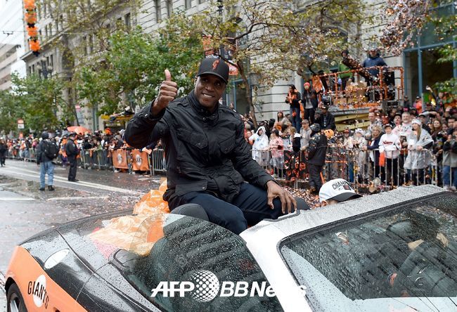 이날 퍼레이드는 브루스 보치 감독, 월드시리즈 MVP 매디슨 범가너 등 샌프란시스코 선수단 뿐 아니라 전체 직원이 참여했고 윌리 메이스와 배리 본즈 등 프랜차이즈 스타도 함께 했다. 오픈카에 탑승한 본즈가 팬들에게 인사하고 있다. 또 낸시 펠로시 미국 민주당 원내 대표 등 저명인사도 함께 했다.