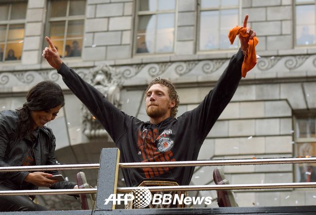 [OSEN=LA(미국 캘리포니아주), 박승현 특파원]월드시리즈 우승을 차지한 샌프란시스코 자이언츠가 1일(이하 한국시간) 캘리포니아주 샌프란시스코 일원에서 우승기념 퍼레이드를 벌였다. 퍼레이드 중 외야수 헌터 펜스가 팬들의 환호에 답례하고 있다.