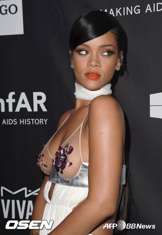 리한나는 29일(현지시간) 미국 로스앤젤레스의 할리우드 밀크 스튜디오에서 열린 '제5회 미국 에이즈 연구재단(amfAR)이 개최한 '인스피레이션 갈라' 행사에 상반신을 거의 노출한 드레스를 입고 참석했다.