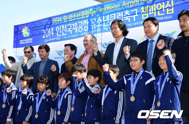 1일 오후 인천국제공항공사 인재개발원 축구장에서 열린 2014 인천국제공항 유소년클럽축구 챔피언십 개막식에서 아르무아 수석코치(왼쪽부터) 이광종 감독, 박완수 인천국제공항공사 사장, 슈틸리케 감독, 최순호 축구협회 부회장, 이운재, 안정환이 유소년 축구 선수들과 기념촬영을 하고 있다.