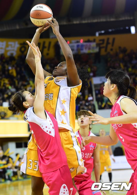 2쿼터, KB스타즈 스트릭렌이 KDB 선수들의 수비를 받으며 슛을 시도하고 있다.