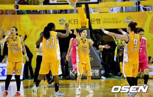3쿼터 종료 직후 KB스타즈 선수들이 하이파이브를 나누고 있다.
