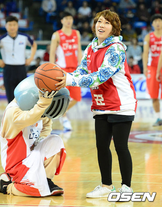 1일 오후 서울 잠실학생체육관에서 열린 '2014-2015 KCC 프로농구' 서울 SK와 고양 오리온스의 경기 시작전 김영희가 시투를 하고 있다.