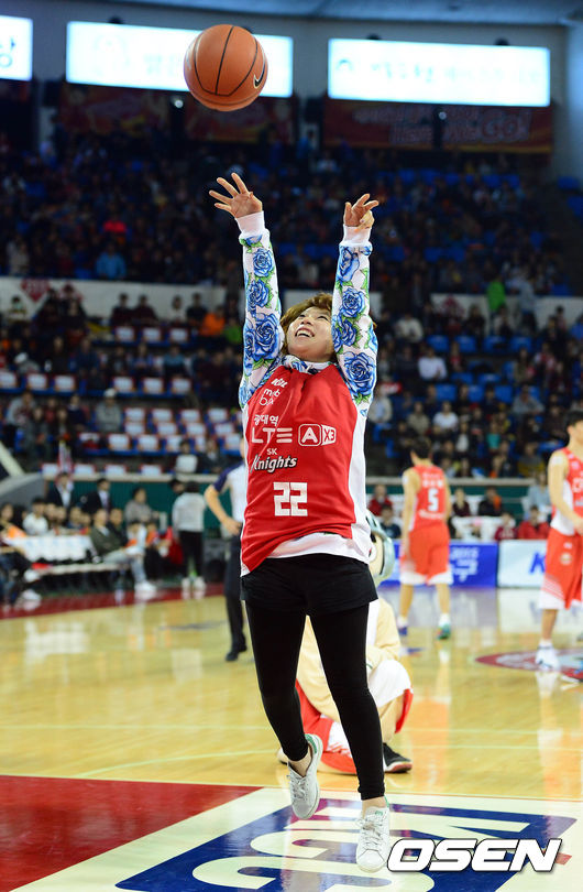1일 오후 서울 잠실학생체육관에서 열린 '2014-2015 KCC 프로농구' 서울 SK와 고양 오리온스의 경기 시작전 김영희가 시투를 하고 있다.