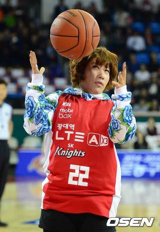 1일 오후 서울 잠실학생체육관에서 열린 '2014-2015 KCC 프로농구' 서울 SK와 고양 오리온스의 경기 시작전 김영희가 시투를 하고 있다.