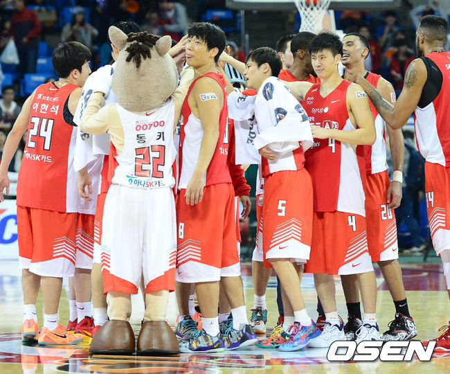 1일 오후 서울 잠실학생체육관에서 열린 '2014-2015 KCC 프로농구' 서울 SK와 고양 오리온스의 경기 종료 후 SK 선수들이 하이파이브를 하고 있다.