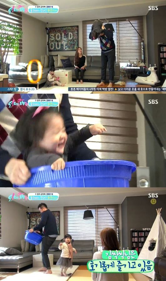 김태우는 1일 방송된 SBS '오 마이 베이비'에서 두 딸 소율과 지율을 즐겁게 해주기 위해 자신의 몸과 힘을 이용, 각종 놀이기구 역할을 했다.