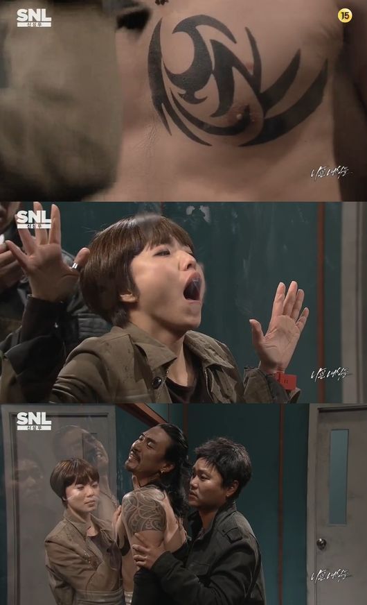1일 방송된 tvN 'SNL 코리아' 호스트 신성우 편에서는 '나쁜 녀석들' 코너에서 안영미와 연기 중 신성우의 근육질 상반신과 타투가 드러났다.