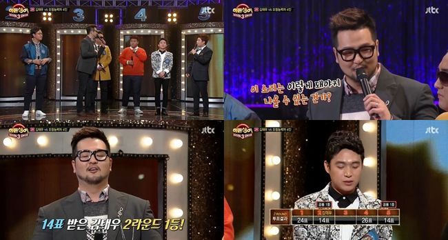 김태우는 1일 오후 방송된 JTBC '히든싱어 시즌3(이하 '히든싱어3')' 2라운드에서 14표를 받으며 공동 1등을 차지했다.