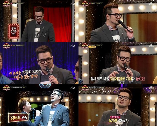 김태우는 1일 오후 방송된 JTBC '히든싱어 시즌3(이하 '히든싱어3')'에서 고득표로 우승을 차지했다.