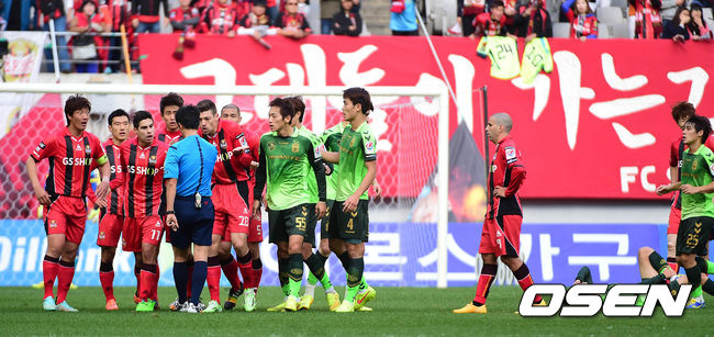 전반 FC서울 김진규의 파울 때 양 팀 선수들이 심판에게 강력하게 항의하고 있다.