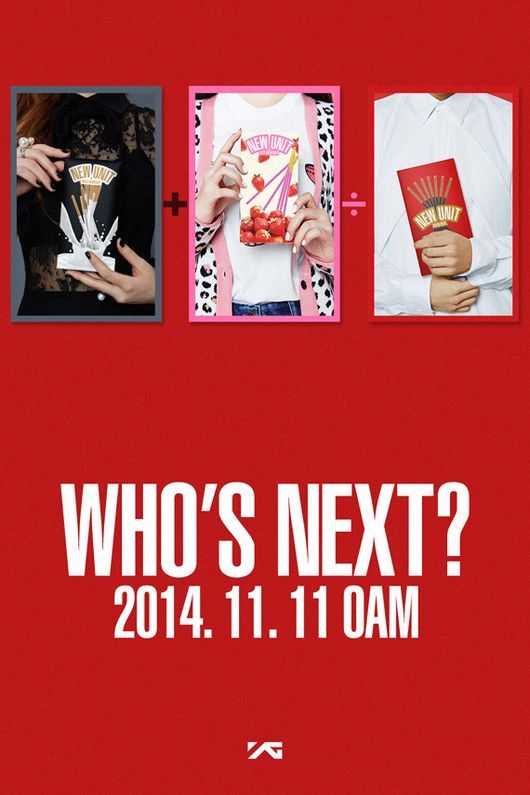 YG는 2일 오후 3시 공식 블로그를 통해 '후즈 넥스트? 2014.11.11 0AM'이란 '뉴 유닛(NEW UNIT)'의 데뷔 시점을 알리면서 얼굴없는 1남2녀의 상반신 티저 포스터를 공개했다. YG가 지난 수 년 동안 준비한 신인 걸그룹이 곧 데뷔할 것이란 소문이 무성한 가운데 11일 선보일 '뉴 유닛'의 정체에 가요계와 팬들은 그동안 큰 관심을 보이고 있었다.
