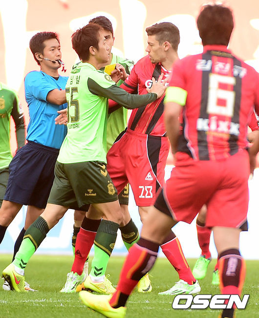 후반 전북 김남일이 FC서울 오스마르에게 파울을 당한 뒤 그를 밀치고 있다.