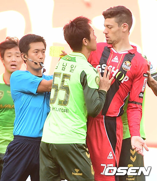후반 전북 김남일이 FC서울 오스마르에게 파울을 당한 뒤 그를 밀치고 있다.