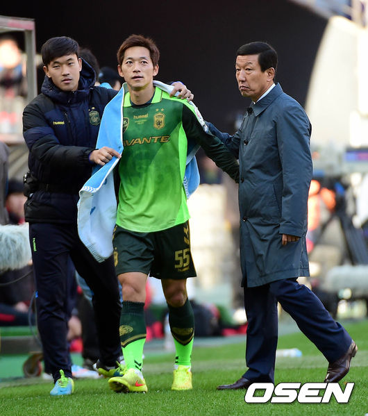 후반 전북 김남일이 교체되며 최강희 감독의 격려를 받고 있다.