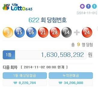 1일 나눔로또에 의하면 로또622회 당첨번호는 9, 15, 16, 21, 28, 34에 보너스 번호는 24다.