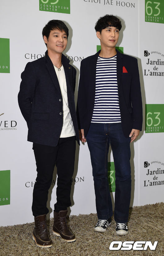 가수 홍경민과 해금연주가 김유나가 2일 오후 서울 여의도 63 빌딩 그랜드볼룸홀에서 백년가약을 맺는다. 결혼식에 참석한 홍경인, 김원준이 포토타임을 갖고 있다. 이날 홍경민의 결혼식은 비공개로 진행될 예정이며 절친 차태현이 사회를 맡고, 김종국은 1부 축가를 부른다. 홍경민은 지난 2월 KBS 2TV '불후의 명곡' 3.1절 특집에 출연했다가 해금연주자로 참여한 예비 신부와 첫 인연을 맺었다. 평소 이상형에 가까운 김유나 씨 모습에 호감을 갖던 홍경민이 4월 초, 프러포즈 송인 '마지막 사랑에게'를 발표하게 되면서 급격히 가까워졌다. / youngrae@osen.co.kr