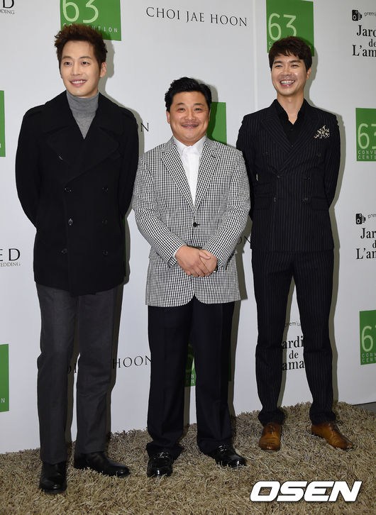 결혼식에 참석한 김재원, 윤정수, 박수홍이 포토타임을 갖고 있다.