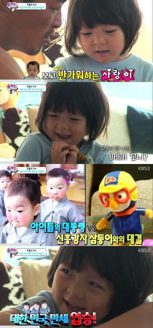 2일 방송된 KBS 2TV 예능프로그램 '해피선데이-슈퍼맨이 돌아왔다'에서는 사랑이가 배우 송일국의 세 쌍둥이인 '삼둥이' 대한-민국-만세에 대한 넘치는 애정을 드러내는 모습이 전파를 탔다.