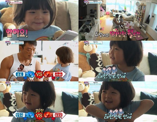 ‘추사랑배 이상형 월드컵’의 태풍의 핵은 ‘마성의 삼둥이’ 대한-민국-만세였다. 사랑이는 “유토랑 아빠 중에 누가 더 좋아?”라며 기대감에 드러낸 추성훈을 실망케 했다. 선택 항목에도 없던 대한-민국-만세를 뽑으며 수줍은 미소를 터뜨린 것. 추성훈은 유토에 이어 난데없이 나타난 제 2의 라이벌에 황당함을 감추지 못하는 모습이었다.