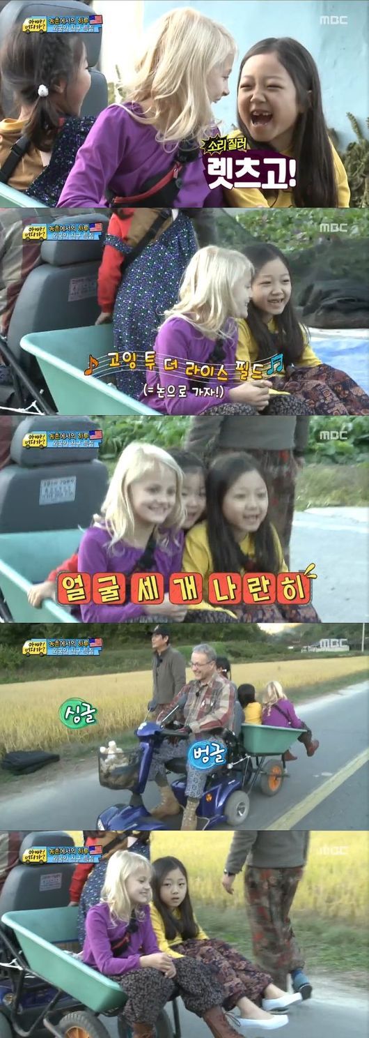 2일 오후 방송된 MBC 예능프로그램 '일밤-아빠!어디가?'(이하 '아빠어디가')에서는 함께 바이크에 딸린 공간에 올라타 시골길을 질주하는 세 소녀의 모습이 그려졌다.