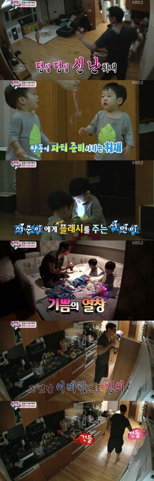 '육아전문 개그맨'으로 거듭난 이휘재가 쌍둥이 서언, 서준 형제와 한밤중 광란의 댄스타임에 빠져들었다.