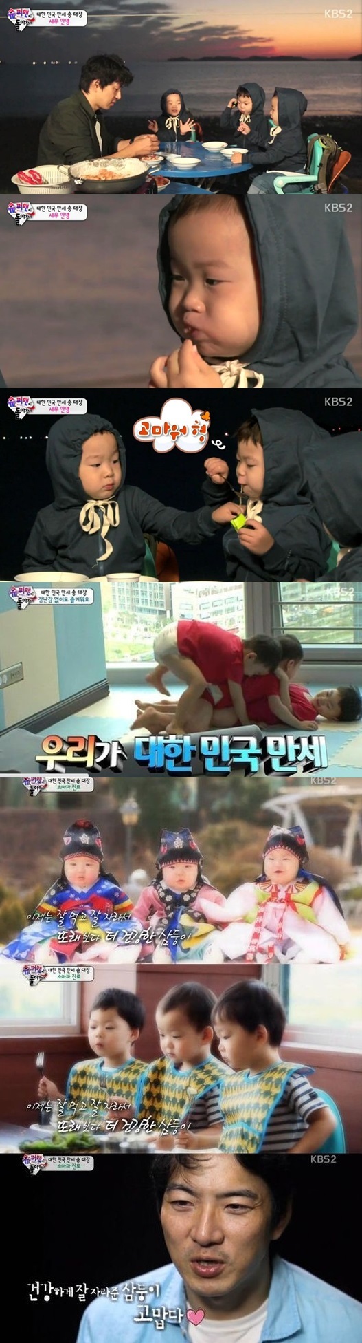 2일 방송된 KBS 2TV 예능프로그램 '해피선데이-슈퍼맨이 돌아왔다'(이하 '슈퍼맨이 돌아왔다')에서는 아빠들의 칭찬에 성장하는 아이들의 모습을 다룬 '잘한다 잘한다 자란다!' 편이 전파를 타운데 가운데, 송일국이 삼둥이(대한-민국-만세)를 데리고 소아과에 방문한 모습이 그려졌다.