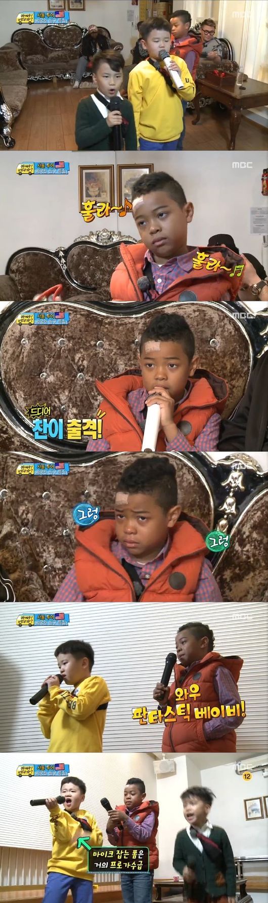 이날 윤후와 안리환은 현숙의 '춤추는 탬버린'을 불렀다 100점을 맞았다. 이어 윤후와 함께 '눈,코,입'에 도전한 찬은 96점을 맞고 울상을 지었다. 노래 대결에서 졌다고 생각한 것.