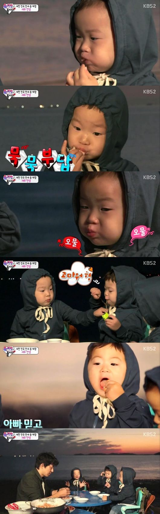 2일 방송된 KBS 2TV 예능프로그램 '해피선데이-슈퍼맨이 돌아왔다'(이하 '슈퍼맨이 돌아왔다')에서는 삼둥이가 아빠인 배우 송일국과 함께 대하 구이를 먹는 시간을 가졌다. 이른바 '새우 안녕'. 처음으로 새우를 본 삼둥이는 처음에는 무서워 어쩔 줄 몰라 하다가 이내 맛있는 먹방을 선보여 웃음을 안겼다.