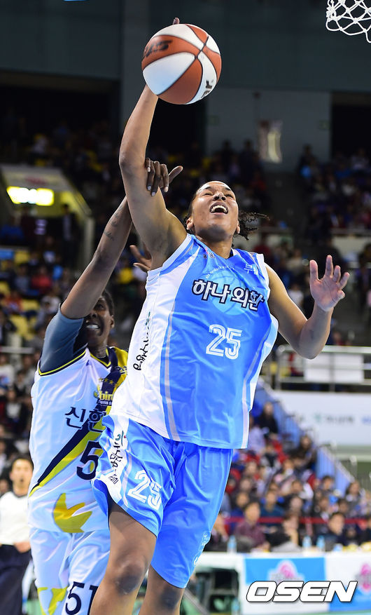 2일 오후 경기 부천시 부천실내체육관에서 KB국민은행 2014-2015 여자프로농구 부천 하나외환과 인천 신한은행의 경기, 1쿼터 하나외환 토마스가 신한은행 브릴랜드에게 파울을 얻어내고 있다.