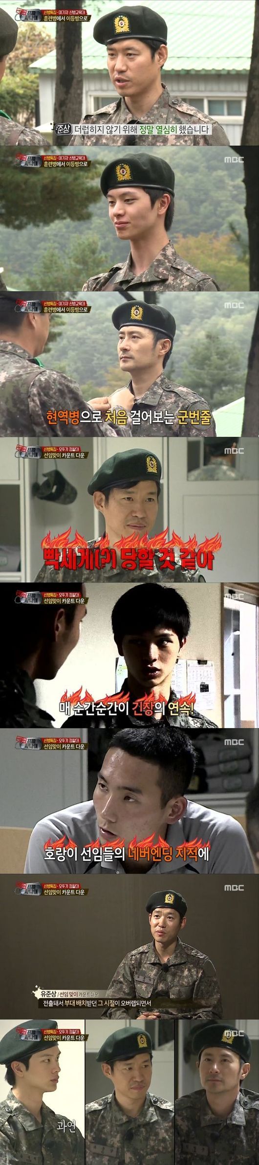이날 선임들을 기다리는 세 신병은 긴장한 듯 고정된 자세로 선임들을 기다렸다. 유준상은 "빡세게 당할 거 같다"고 걱정을 했고 두 멤버 역시 별 말은 없었지만 긴장된 모습을 보였다.