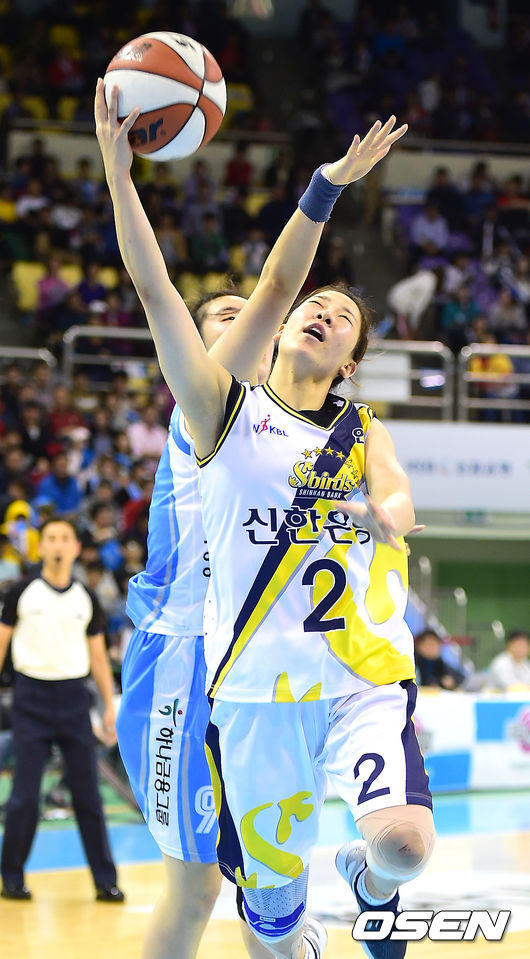 2일 오후 경기 부천시 부천실내체육관에서 KB국민은행 2014-2015 여자프로농구 부천 하나외환과 인천 신한은행의 경기, 3쿼터 신한은행 김규희가 골밑슛을 성공시키고 있다.